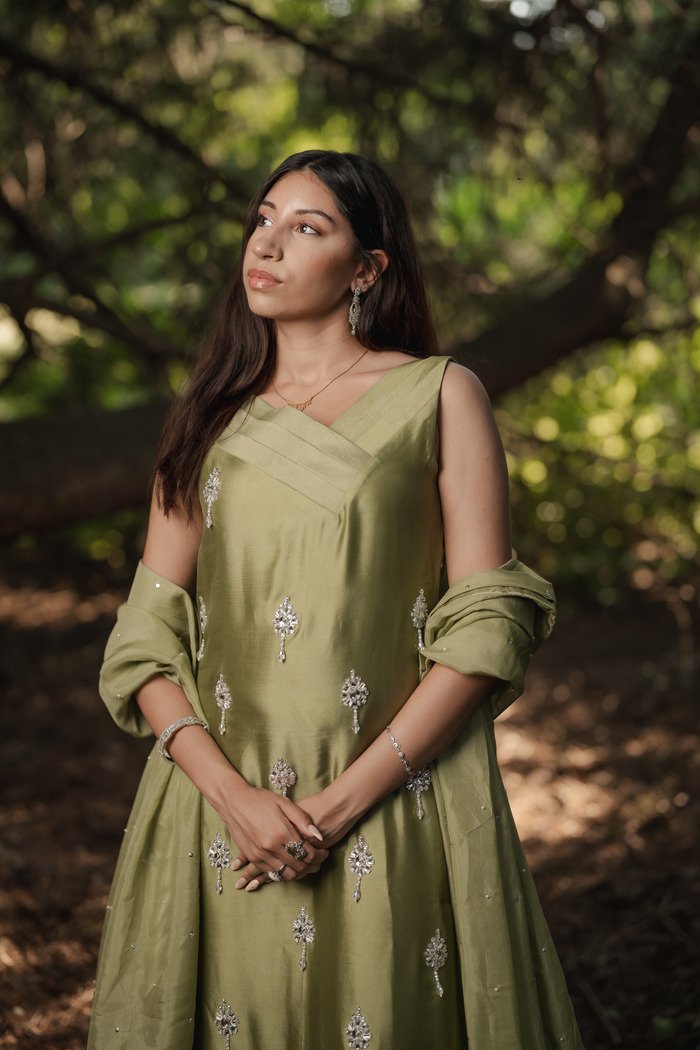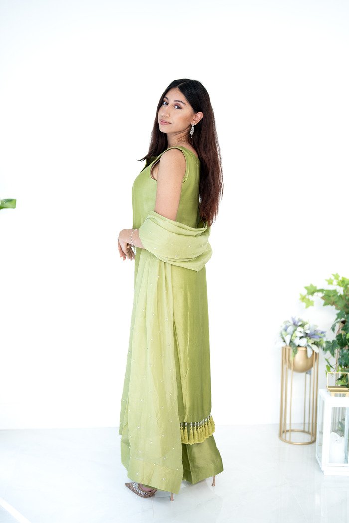 This beautiful dhani green in sheesha silk is elegant and timeless. Tassels add movement and style. A must have.